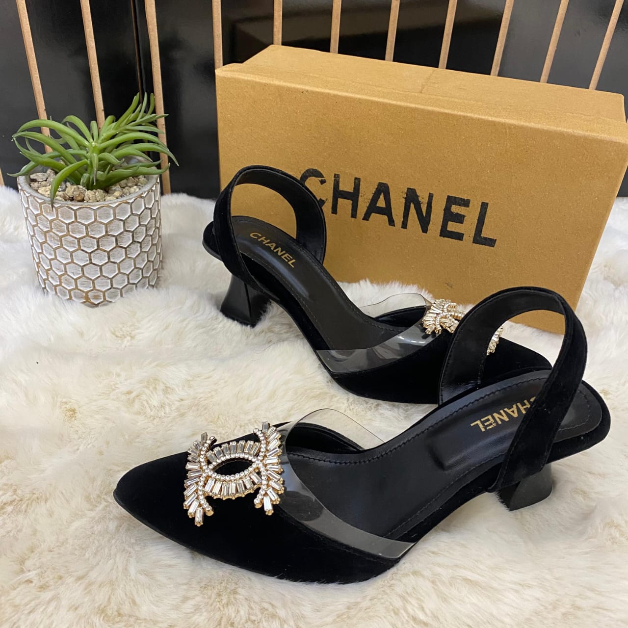 Step into pure elegance with our CC Black Velvet Slingback Pumps, a flawless blend of luxury and comfort. Designed in rich black velvet with a pointed toe, these pumps are beautifully finished with a sparkling crystal CC emblem that adds instant glamour.