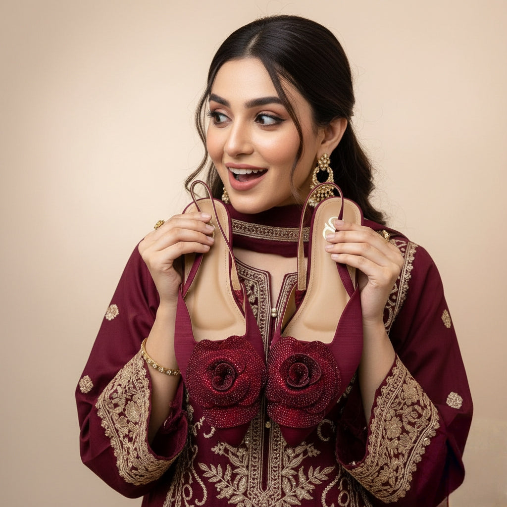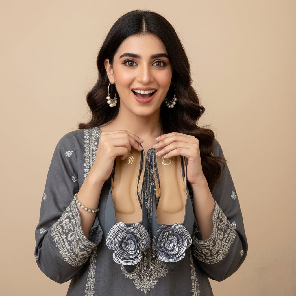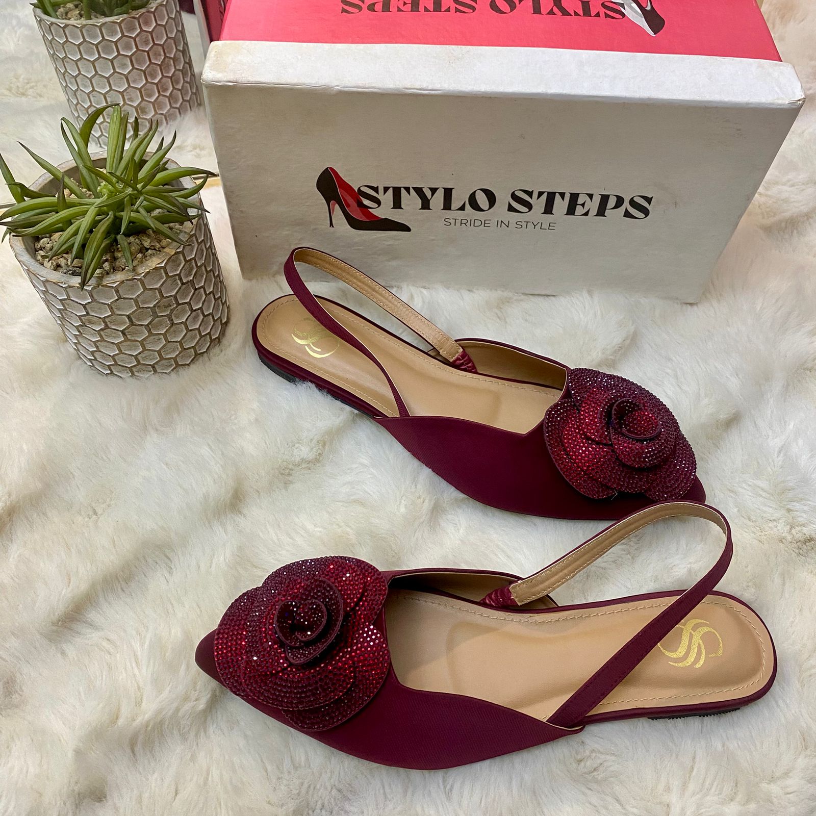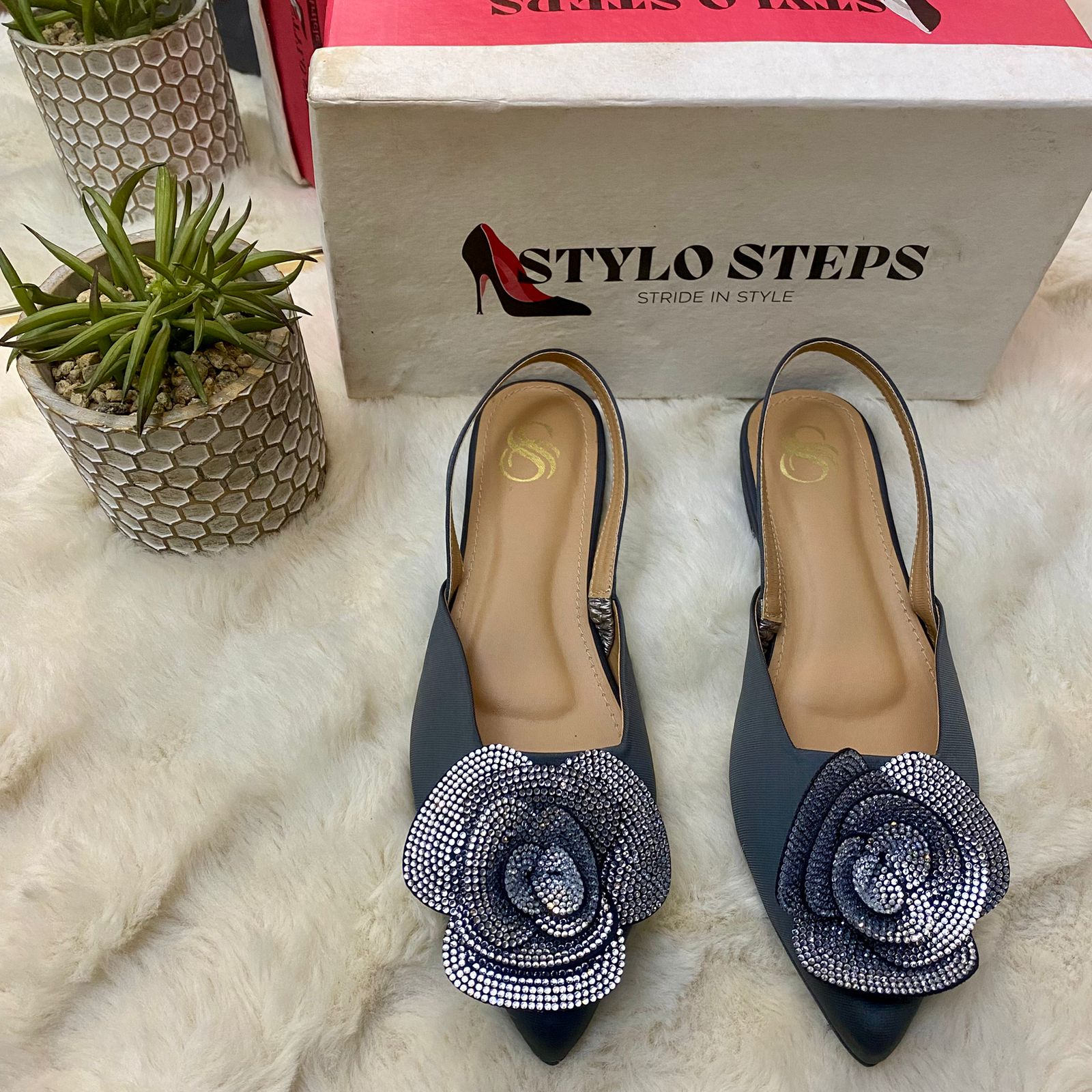 Stylo Steps Rhinestone Rose Mules: Step into instant glamour! These luxurious slip-on mules feature a chic pointed-toe silhouette and are crowned with an oversized 3D rose entirely covered in dazzling rhinestones. Finished with an elegant slingback strap for a perfect fit. Available in Black, Gold, Maroon, and Blue. The perfect blend of comfort and high-wattage shine.