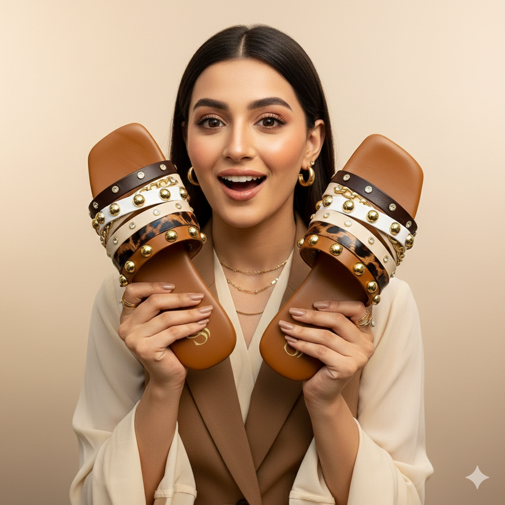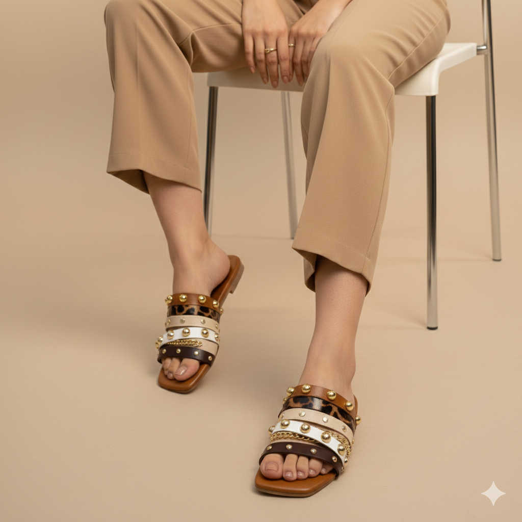 Introducing the Studded Blitz by Stylo Steps - the must-have showstopper for your glam collection. This new trendy design combines bold studs, sparkling stones, and textured straps in rich tan or classic black. Expertly crafted for both style and statement. Stride in style now!
