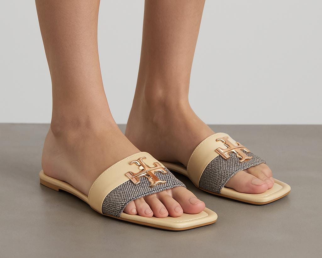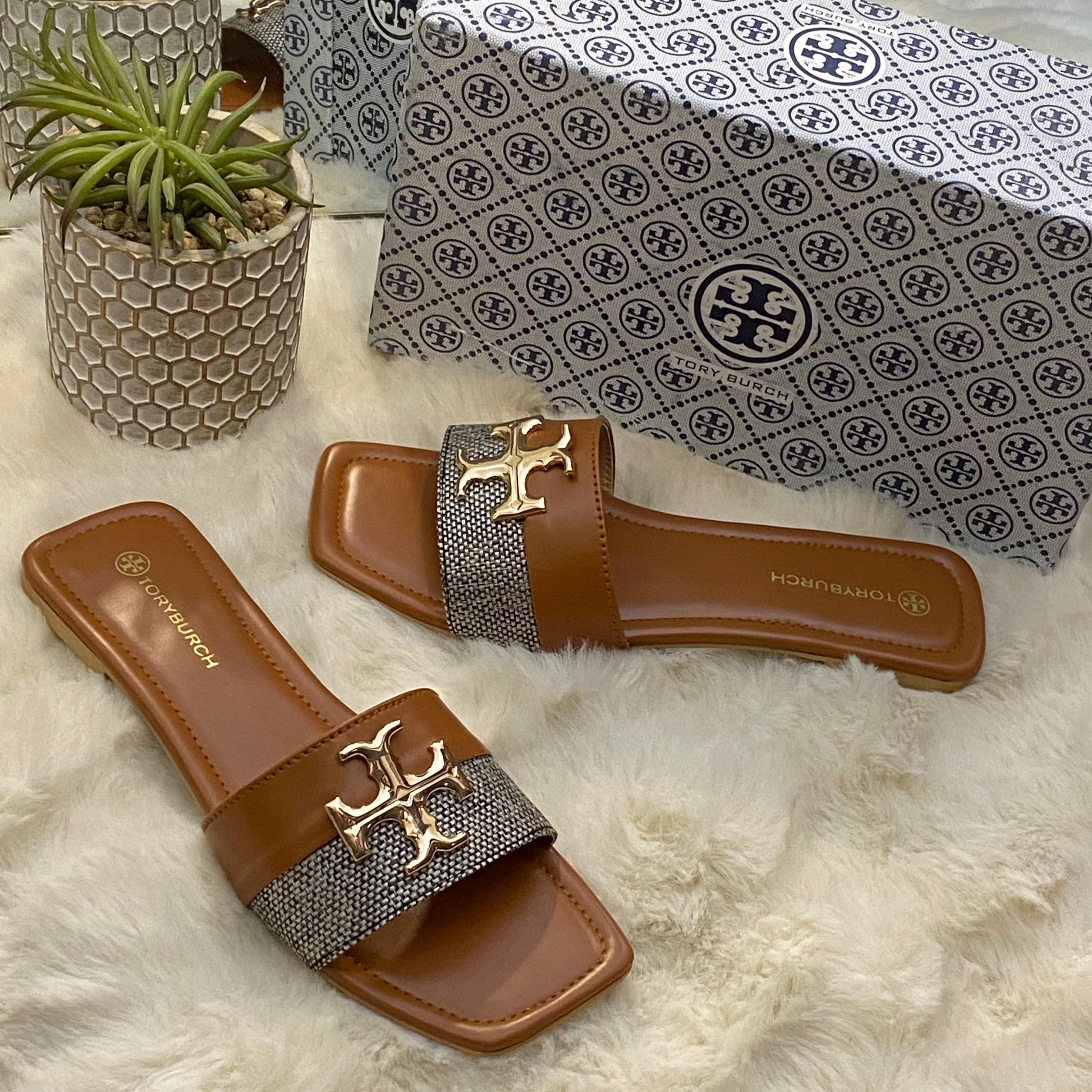 Step into effortless elegance with the Tory Luxe Emblem Slides—a sophisticated fusion of style and comfort, perfect for modern fashionistas. These slides feature a striking metallic Tory Burch emblem atop a textured woven band, complemented by sleek faux leather straps in classic tones like black, nude, and tan. Designed for both casual outings and chic gatherings, the open-toe silhouette offers a breathable fit, while the padded insole ensures all-day comfort.