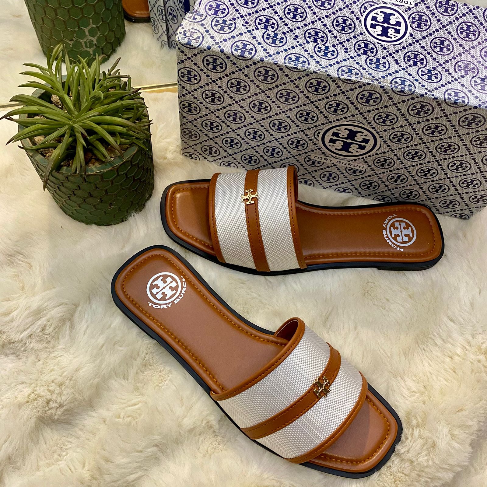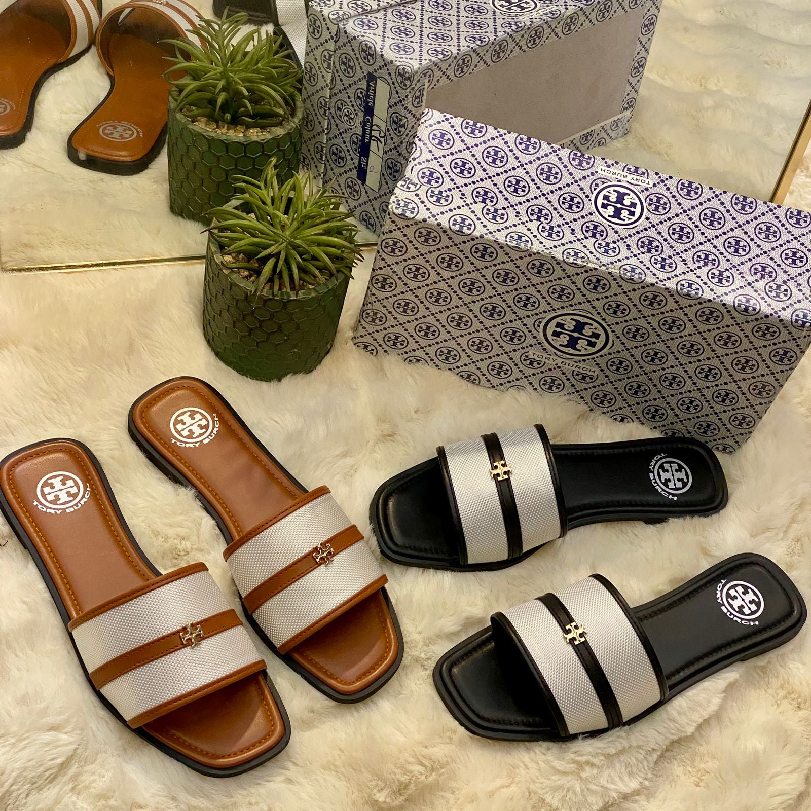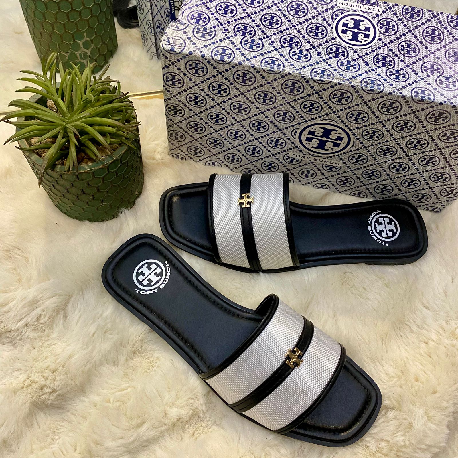 These chic open-toe slides feature a dual-tone strap design crafted from premium textured material, complemented by a sleek metal TT logo plaque at the center for a touch of luxury. The square-toe silhouette gives them a modern edge, perfect for both casual and semi-formal looks.