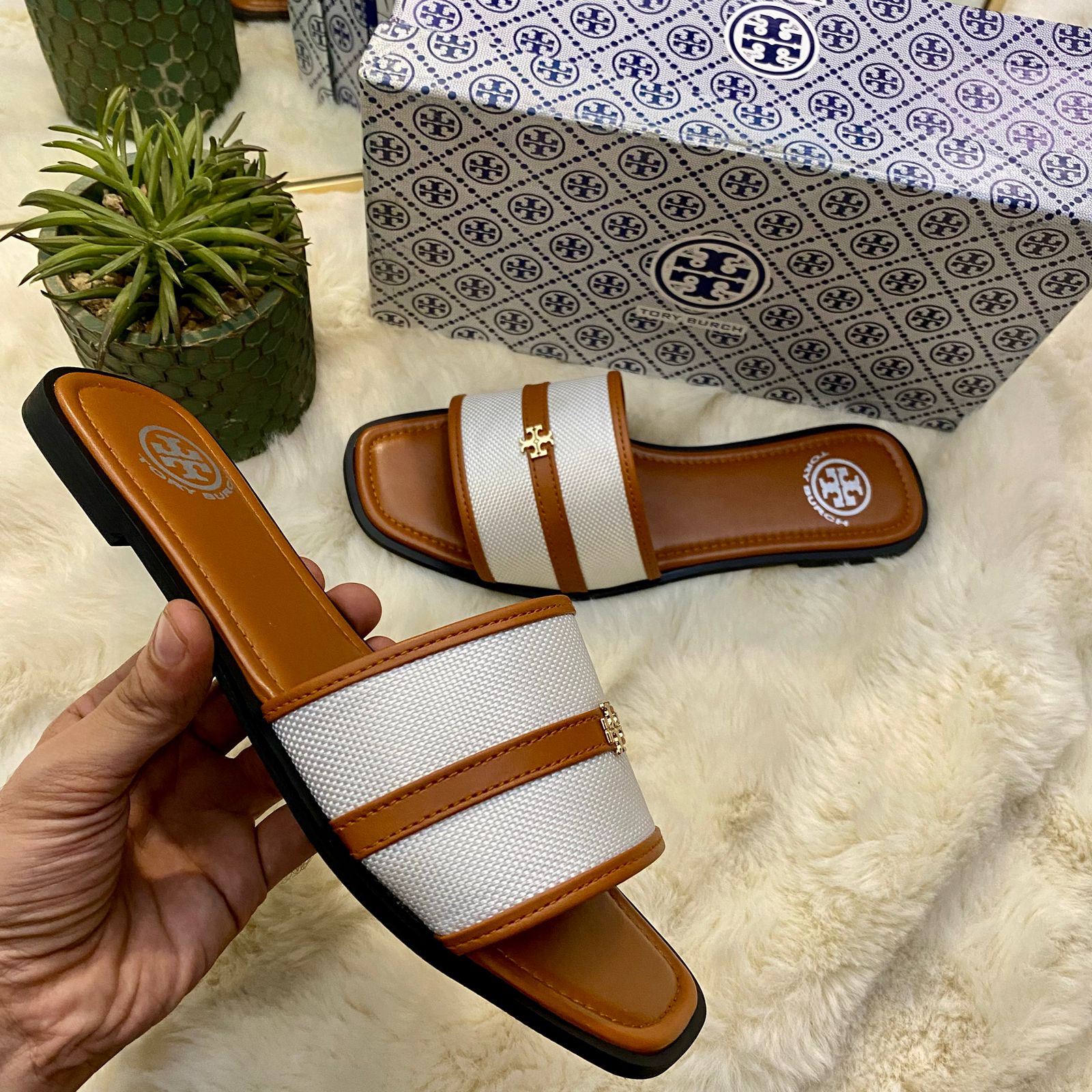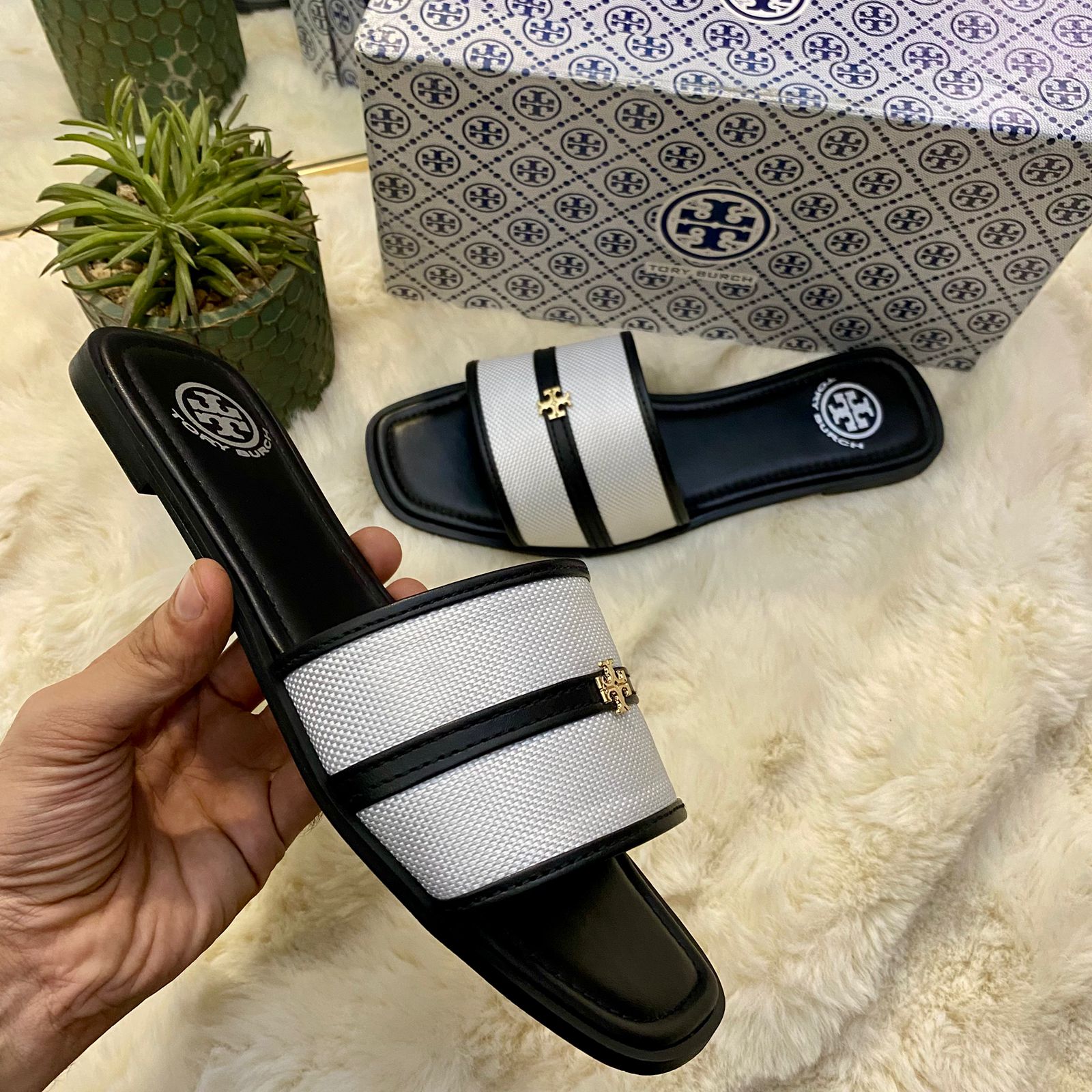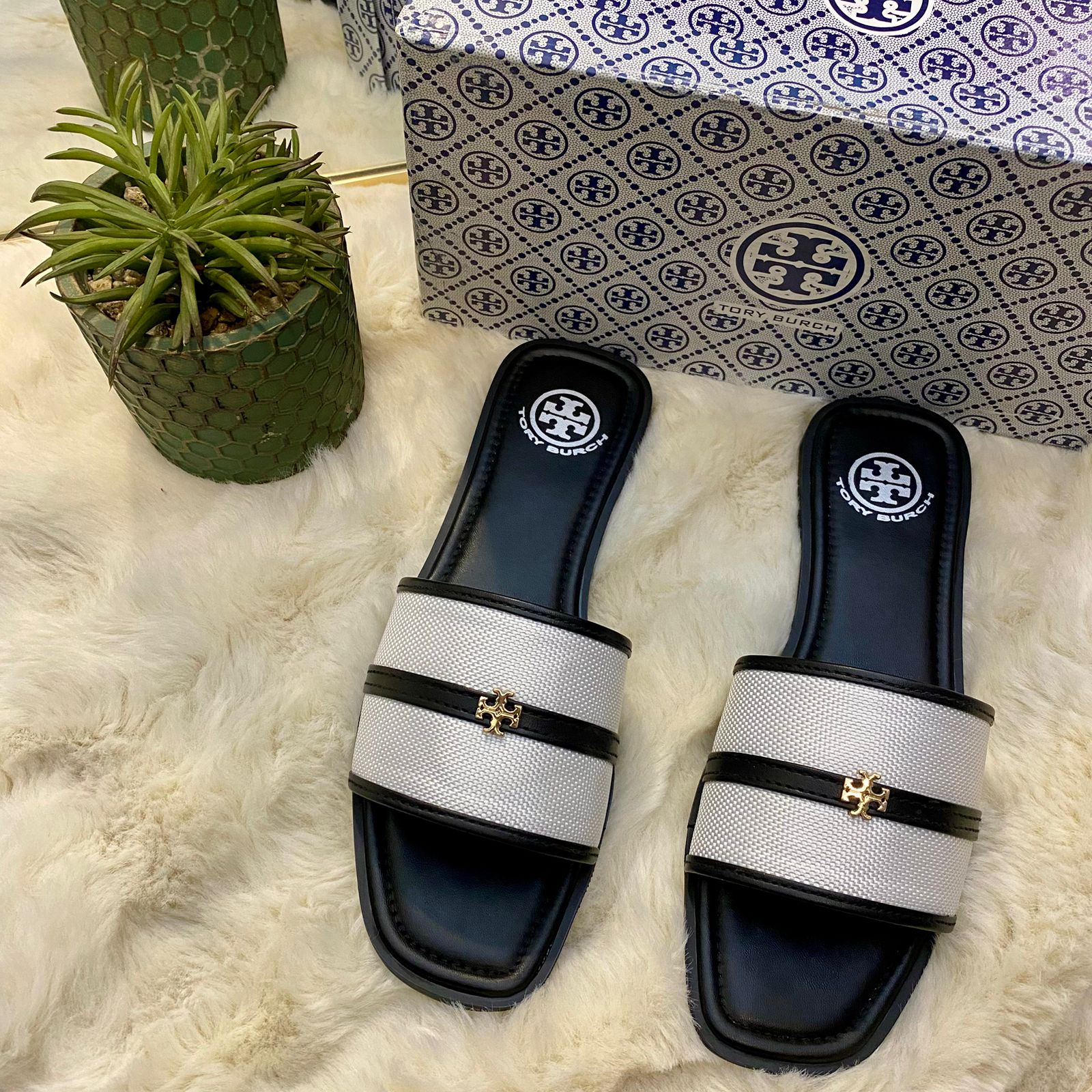 These chic open-toe slides feature a dual-tone strap design crafted from premium textured material, complemented by a sleek metal TT logo plaque at the center for a touch of luxury. The square-toe silhouette gives them a modern edge, perfect for both casual and semi-formal looks.