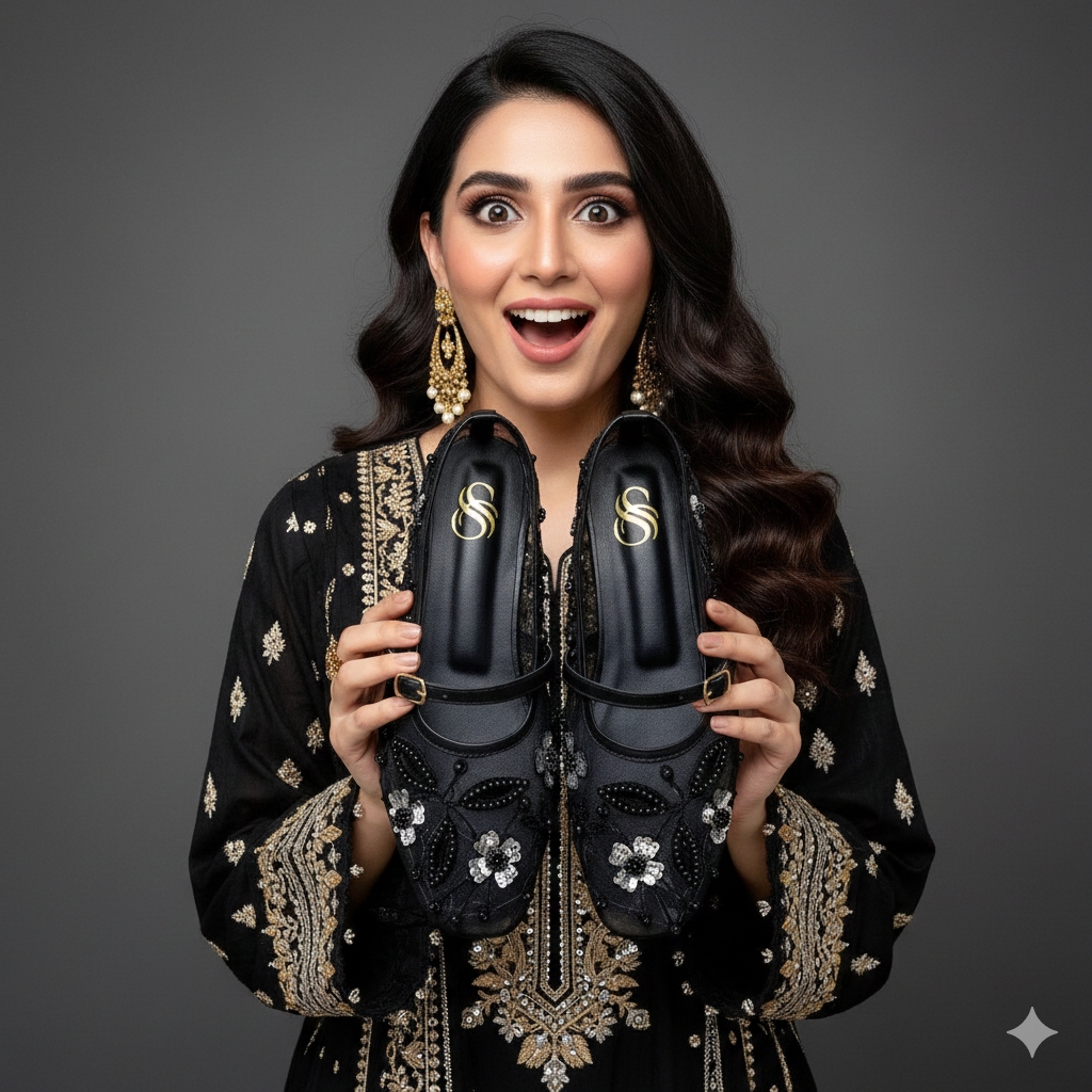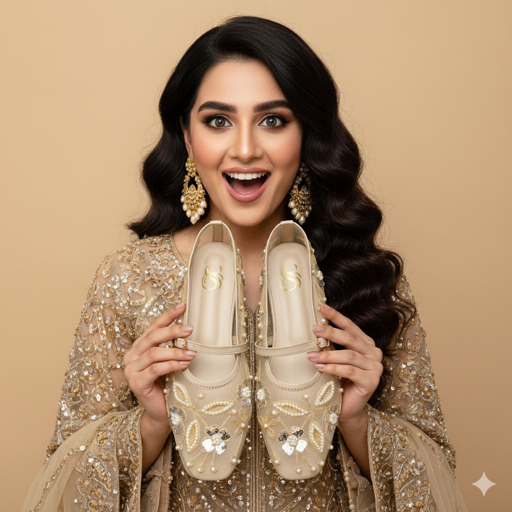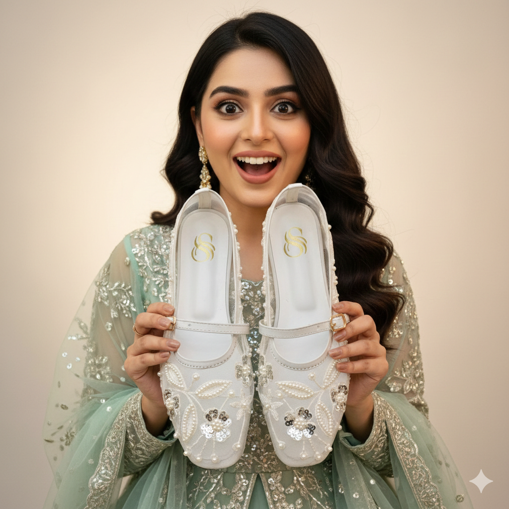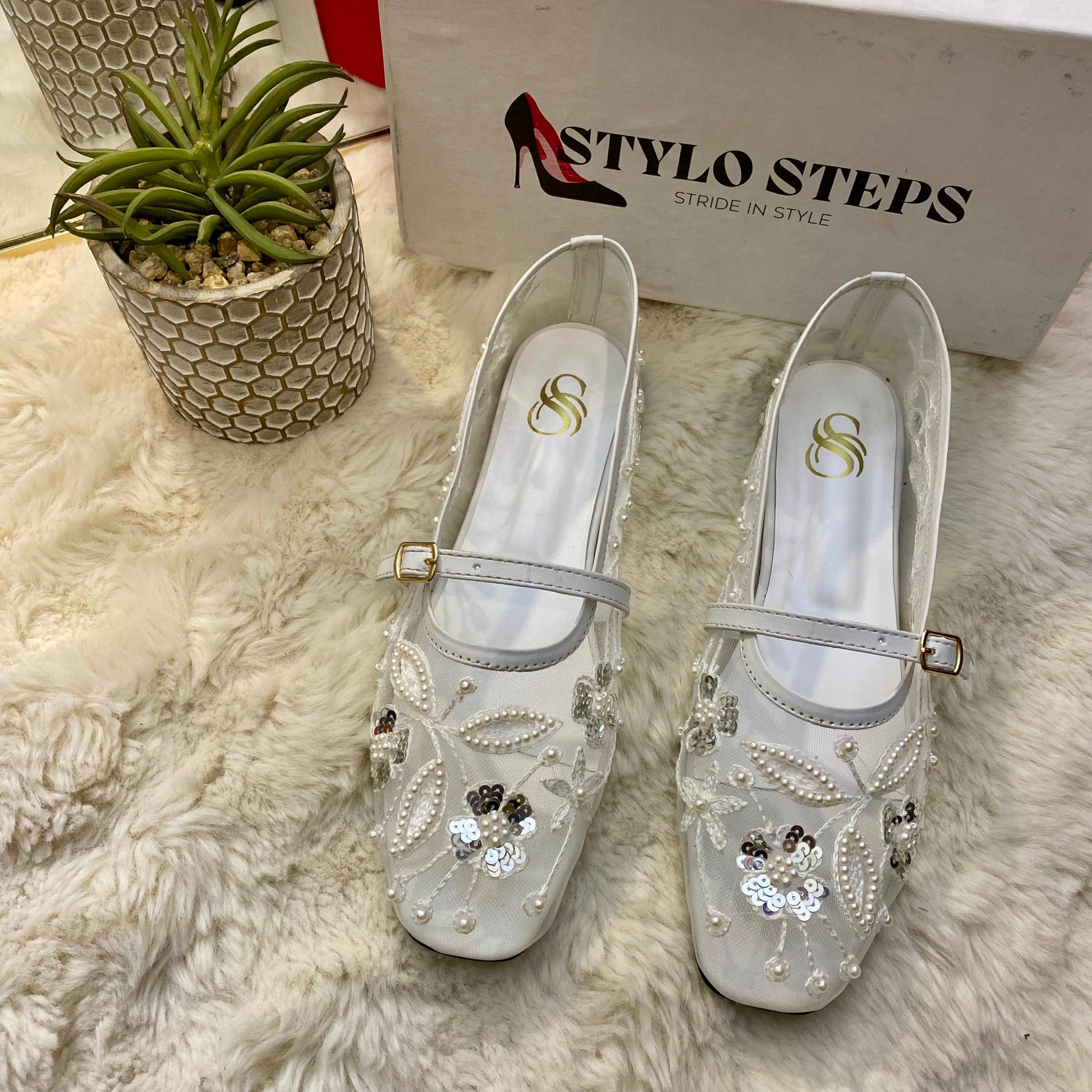 - The Eterna Hit Ballet Pumps by Stylosteps feature an elegant pointed-toe design with a secure Mary Jane strap, enhancing fit stability. Crafted from breathable fine mesh with intricate 3D floral embroidery and hand-placed pearls, these pumps combine luxury and comfort, making them suitable for weddings and formal occasions. The cushioned insole and durable non-slip sole ensure all-day wearability, complementing both Eastern and Western attire in Ivory/Beige, White, and Black options.