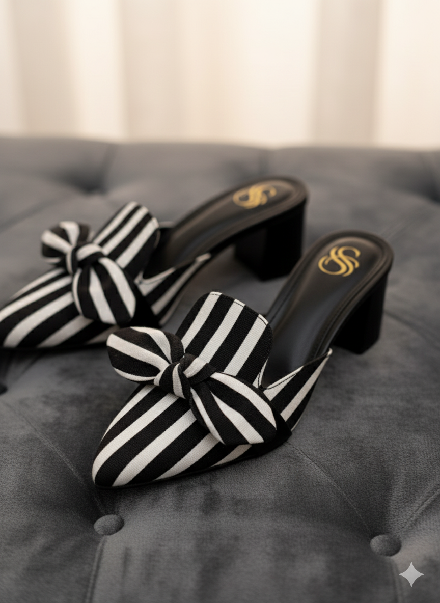 These mules feature a chic black-and-white zebra stripe pattern, perfectly complemented by a stylish oversized bow on the front, adding a touch of sophistication and playfulness. The pointed toe design elongates the foot for a sleek, feminine silhouette, while the comfortable block heel ensures all-day stability and ease.