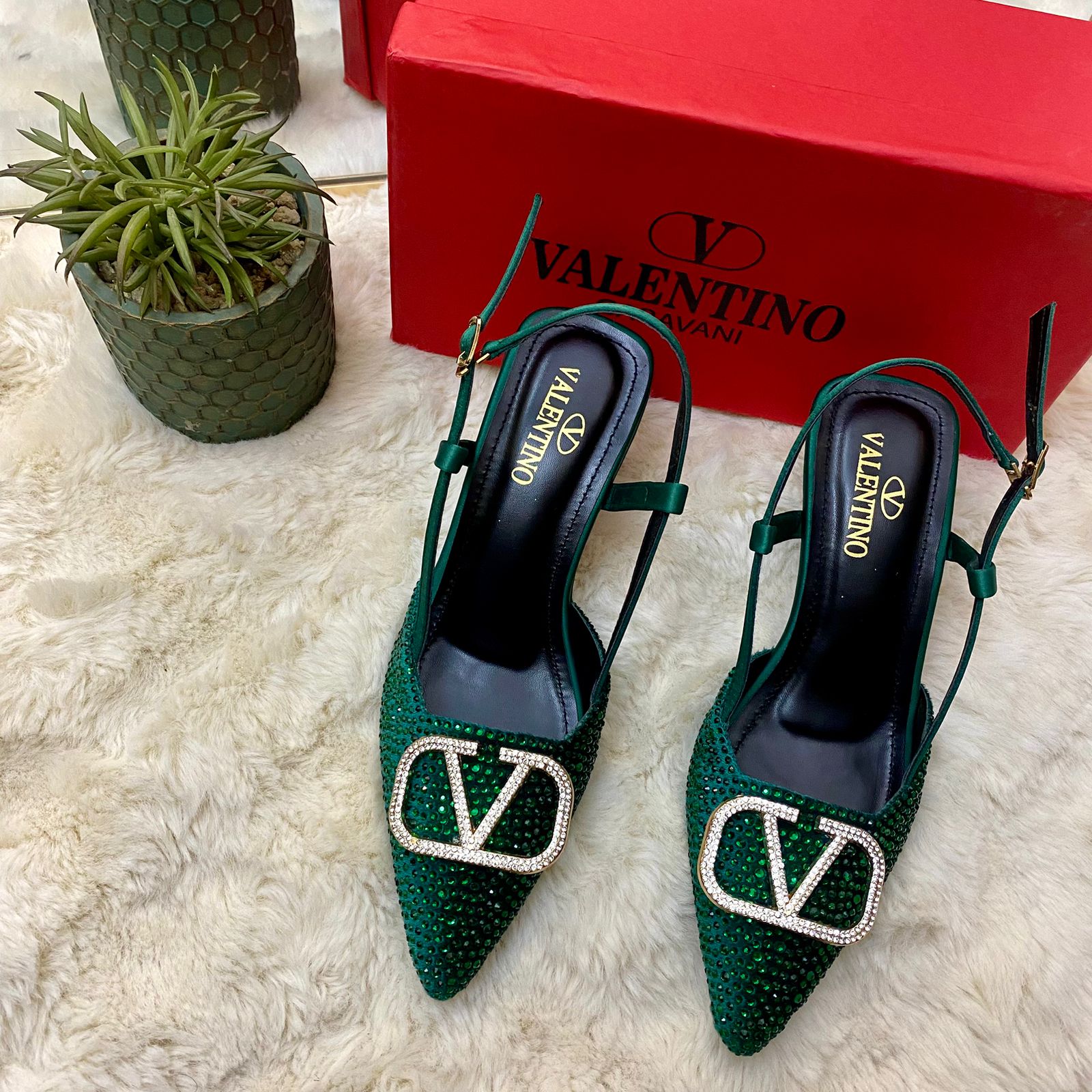 These glamorous pointed-toe slingbacks feature all-over, brilliant crystal embellishment and are crowned with an iconic, oversized, crystal-detailed "V" buckle.