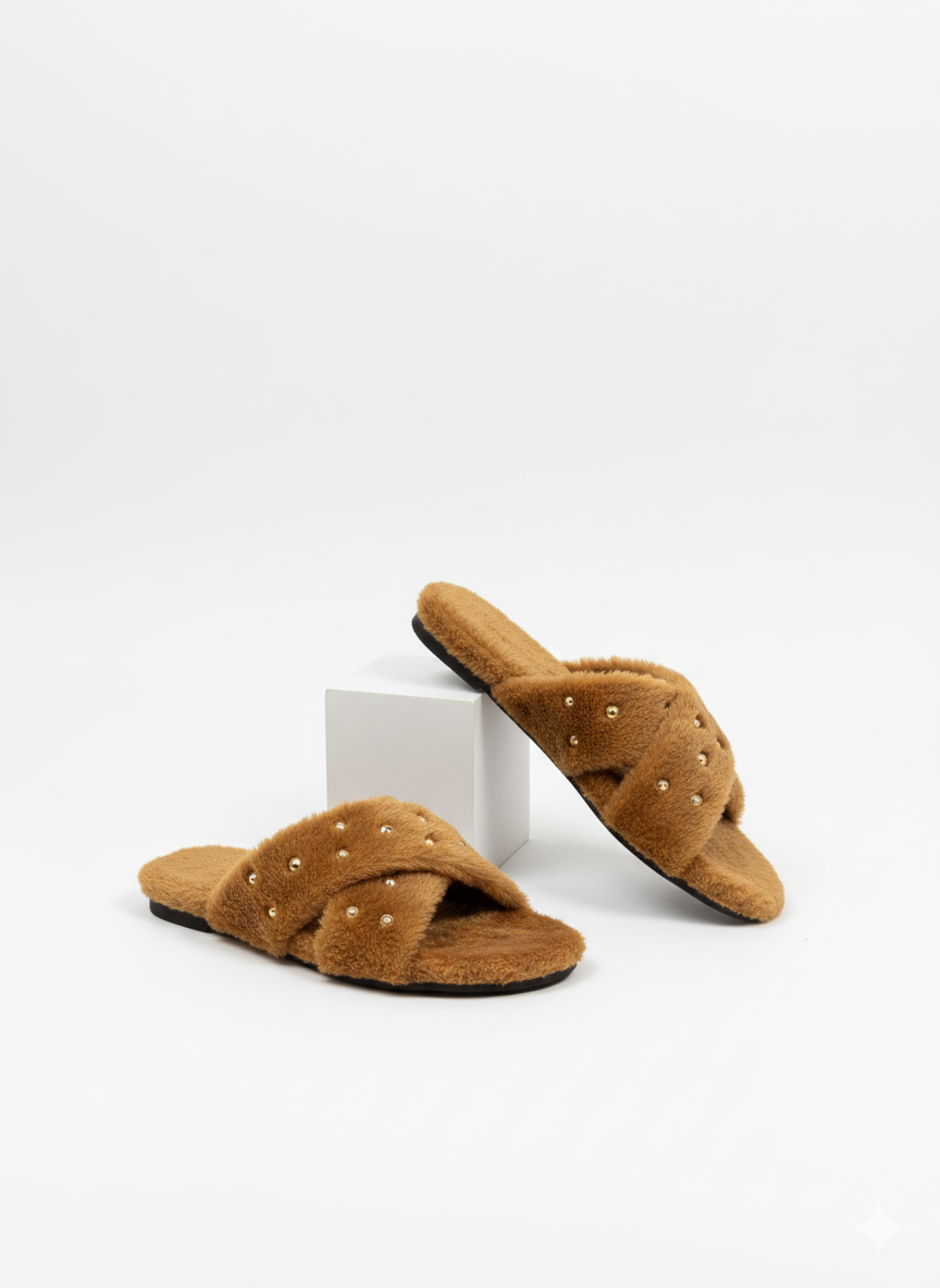 These slides are designed for comfort and stylish indoor/casual wear, featuring a fluffy texture and distinctive metallic embellishments.