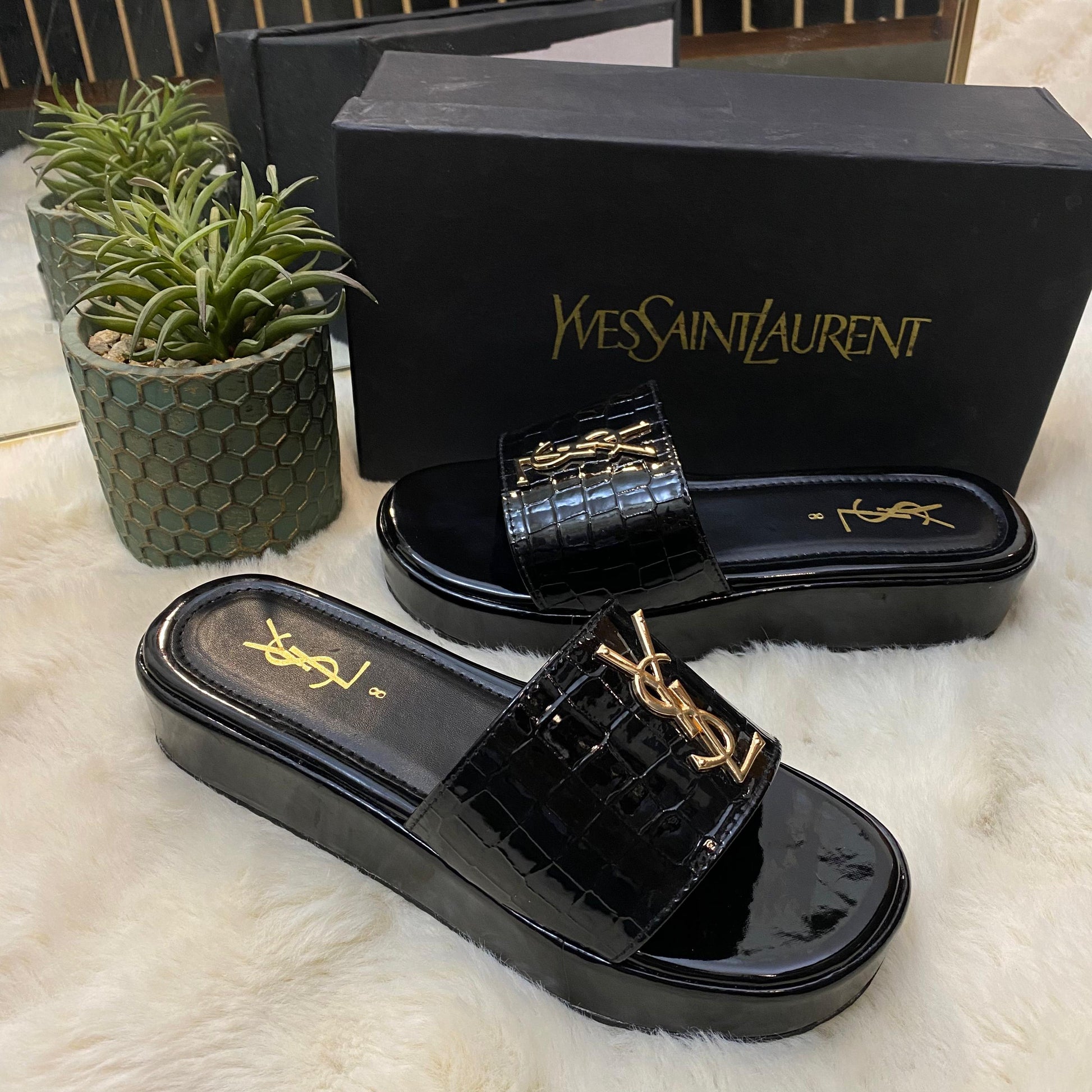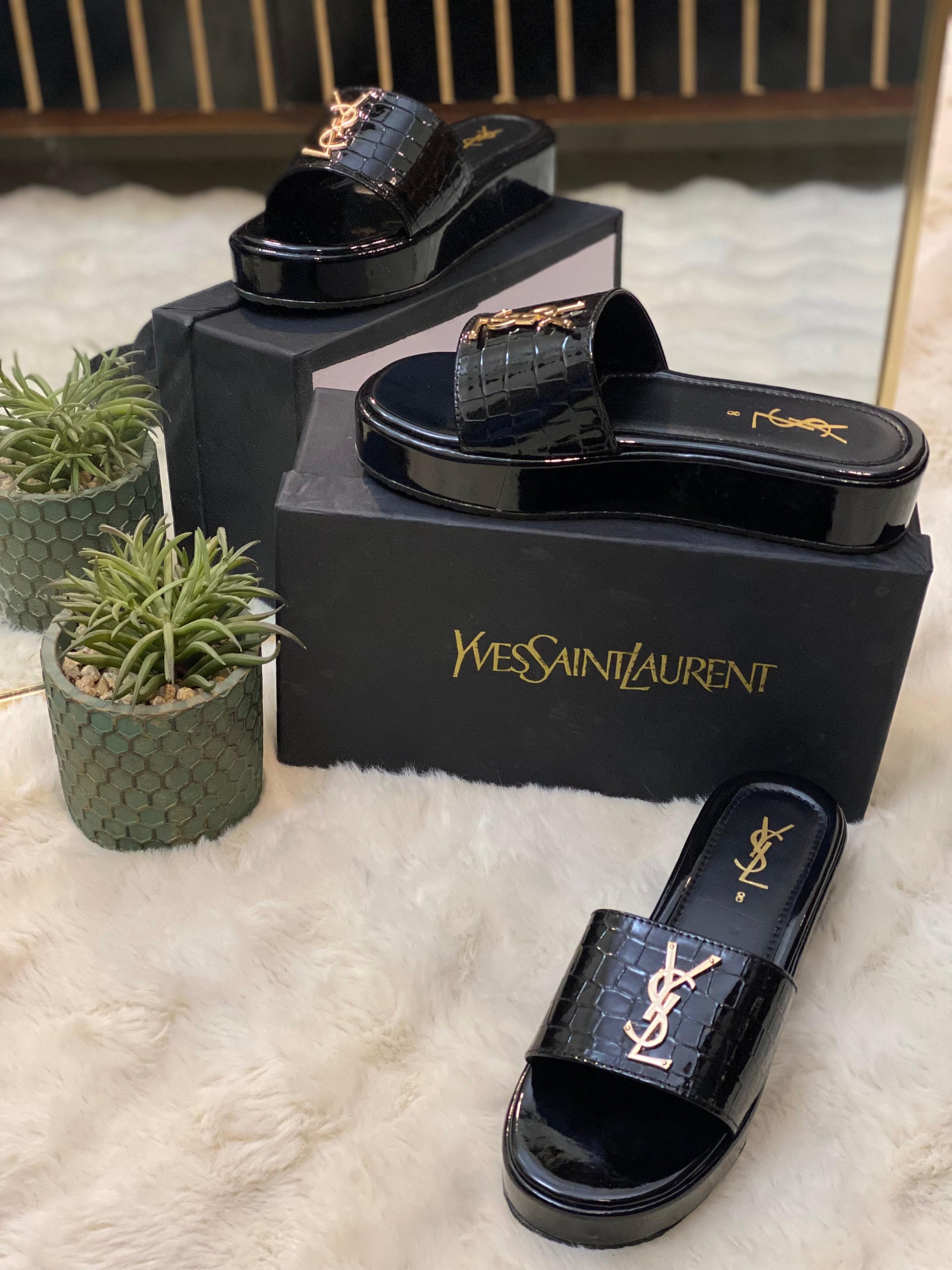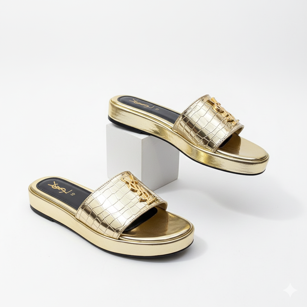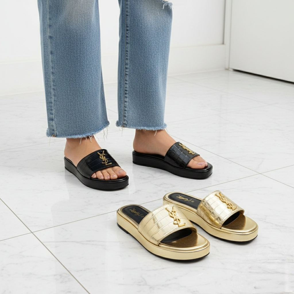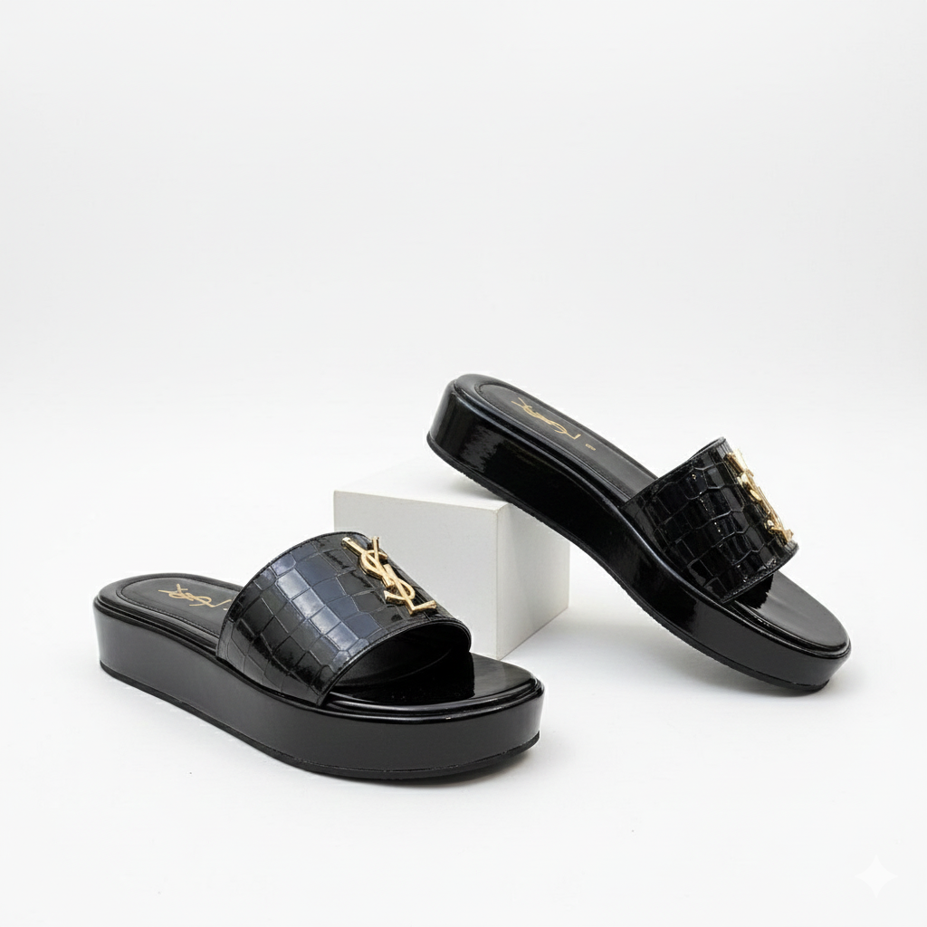 These YSL Stratos Wedges by Stylosteps are luxury-inspired platform slides designed for a bold, sophisticated look.
