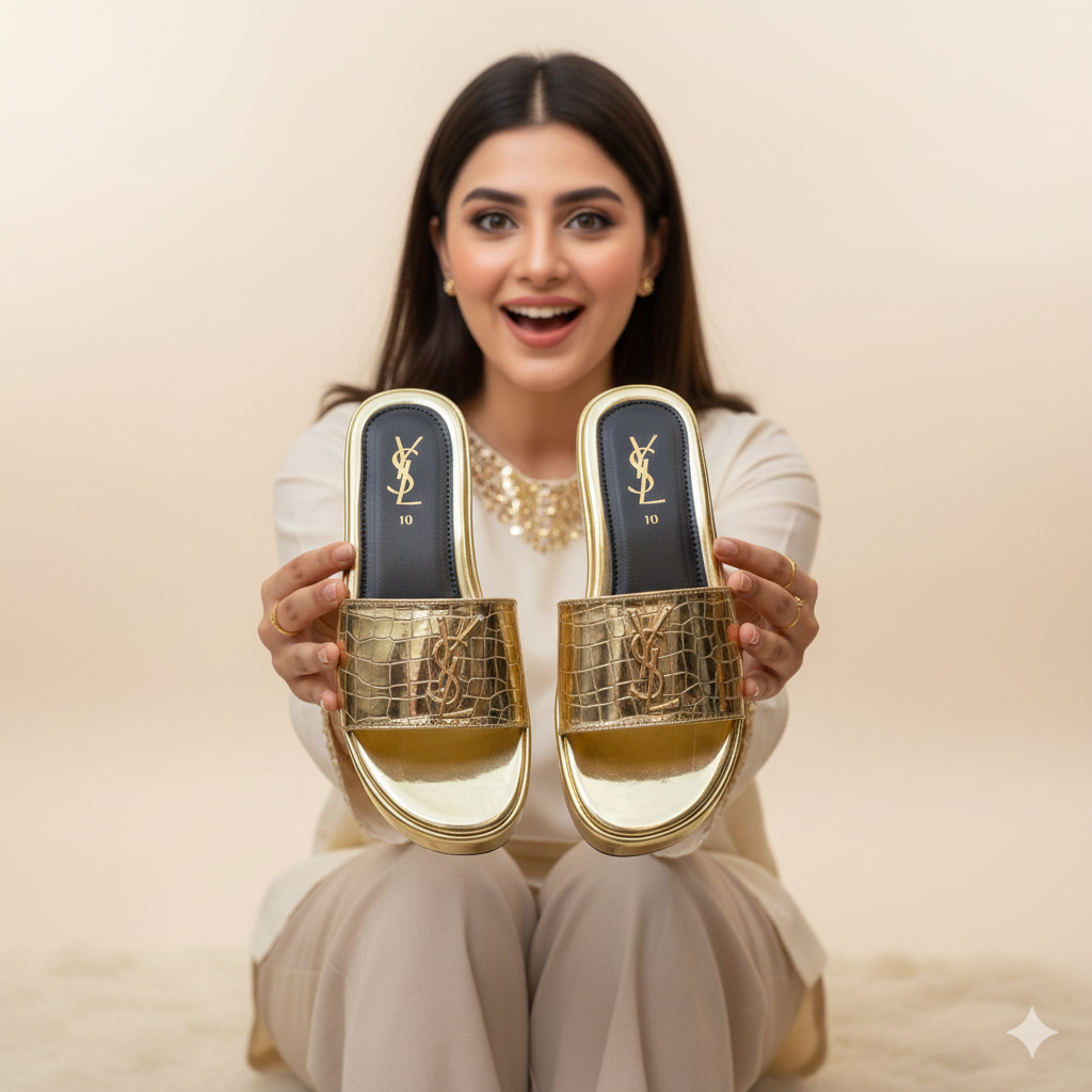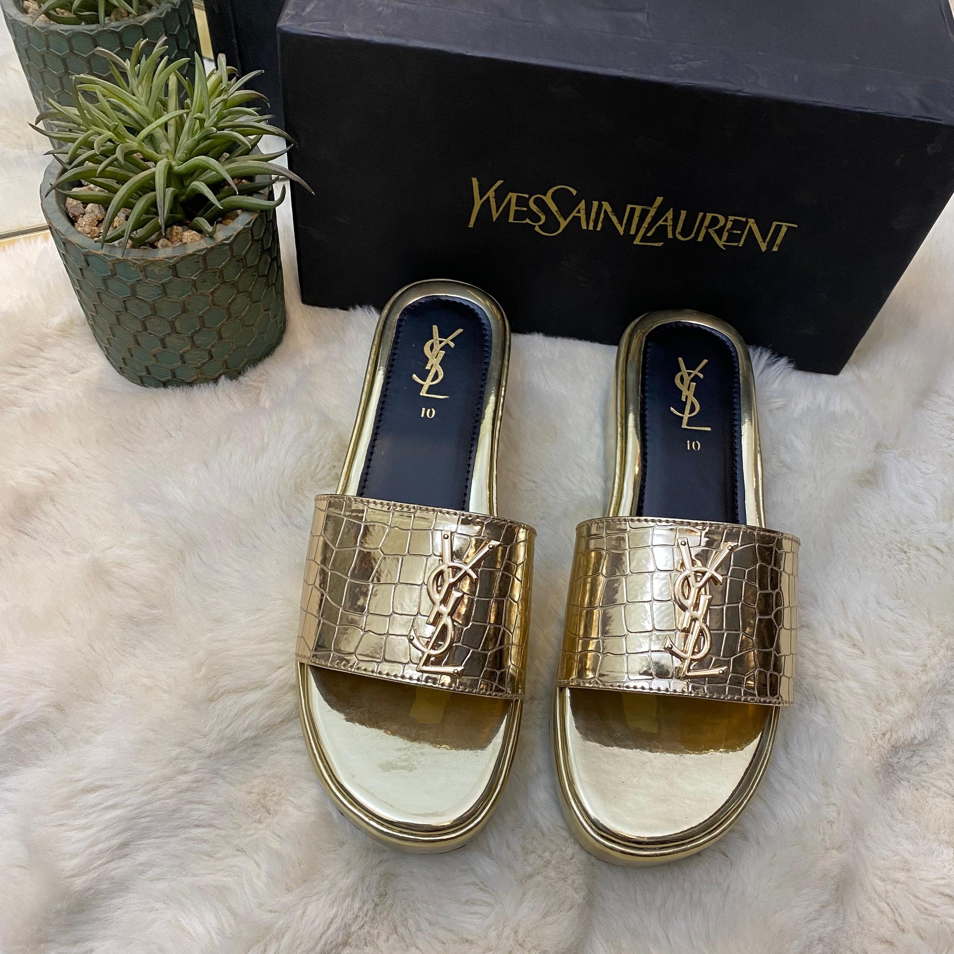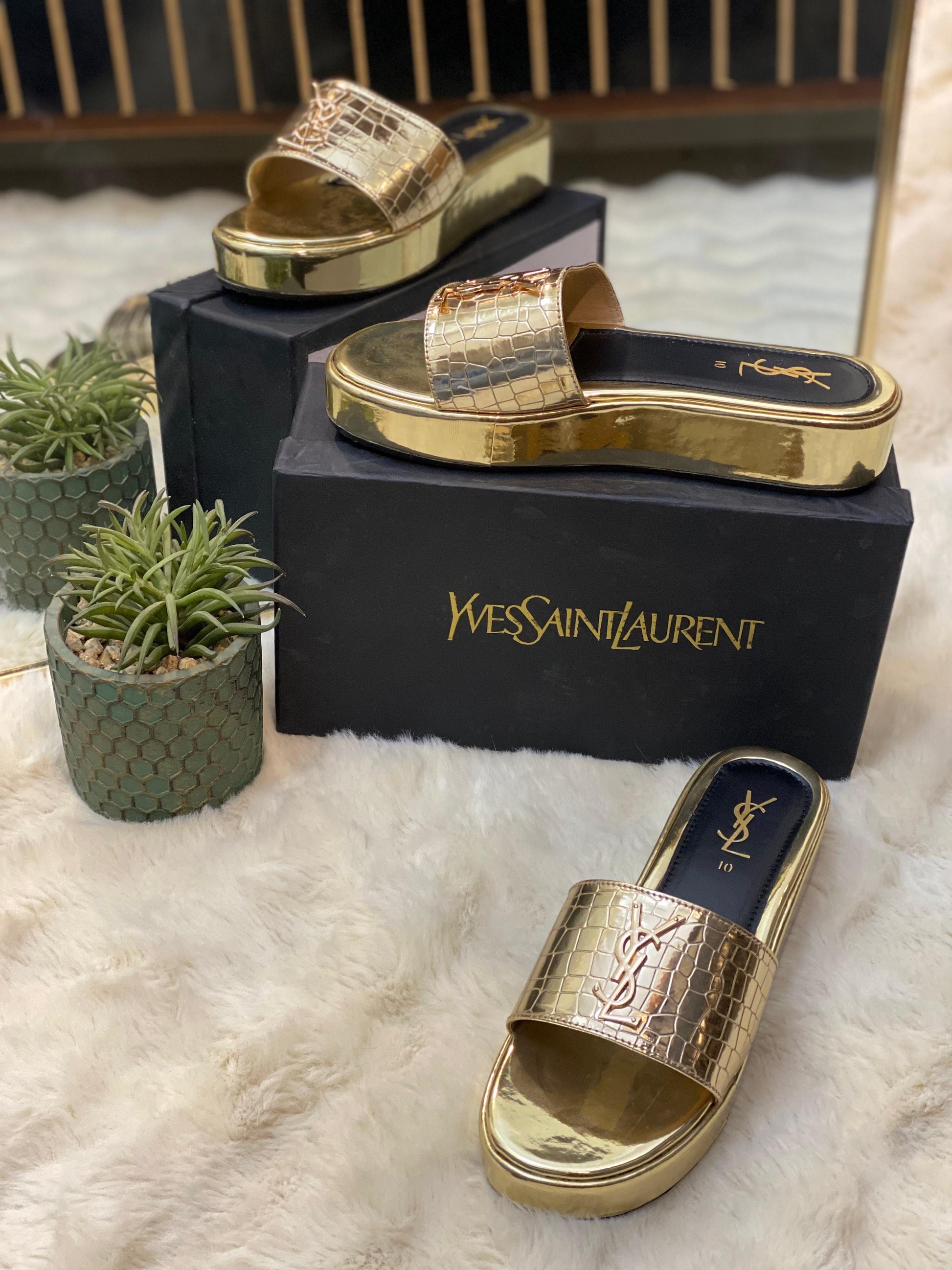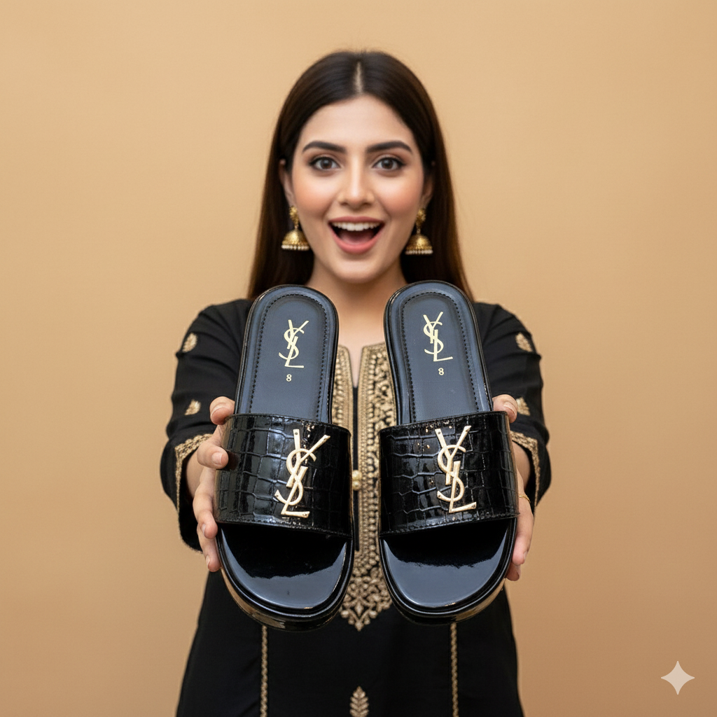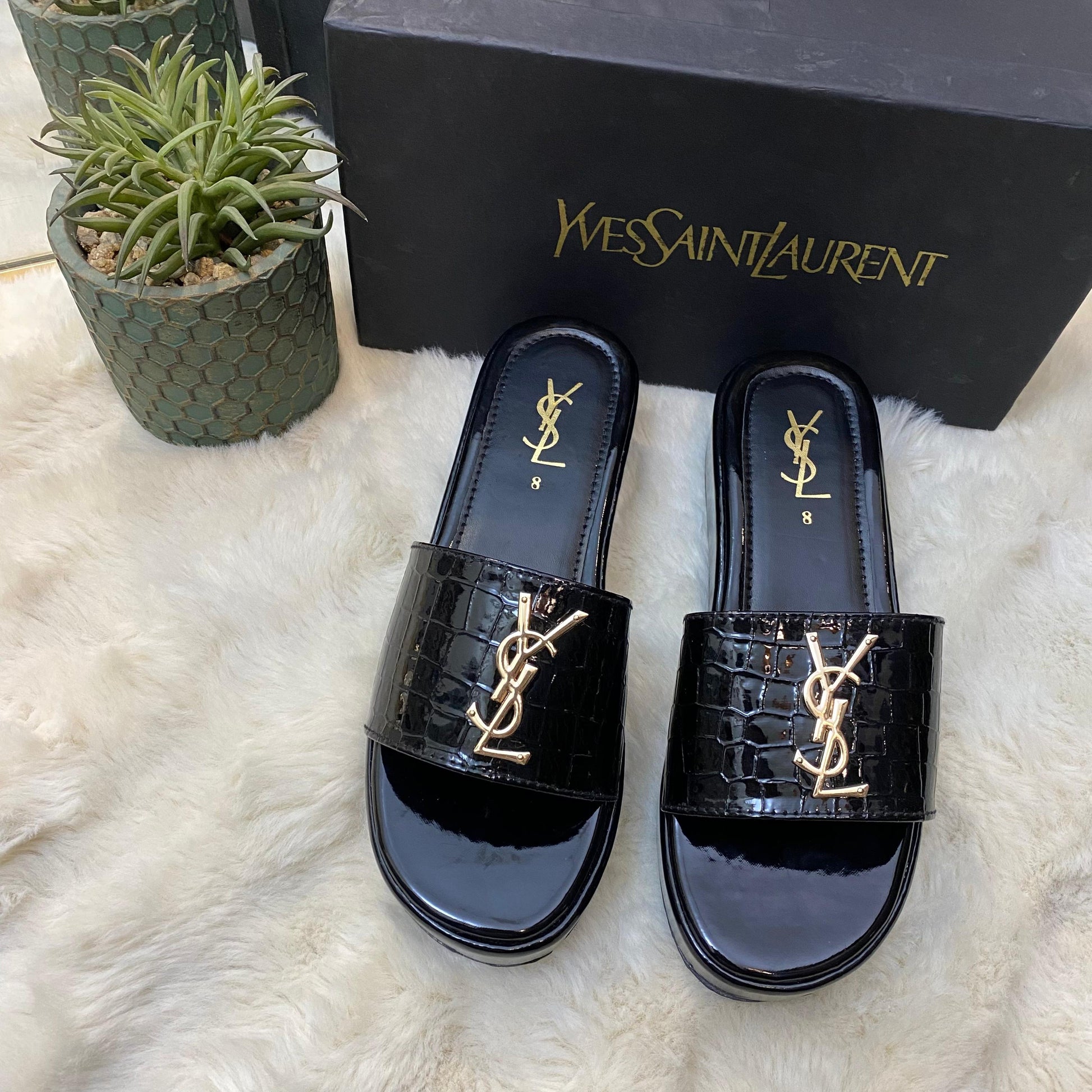 These YSL Stratos Wedges by Stylosteps are luxury-inspired platform slides designed for a bold, sophisticated look.