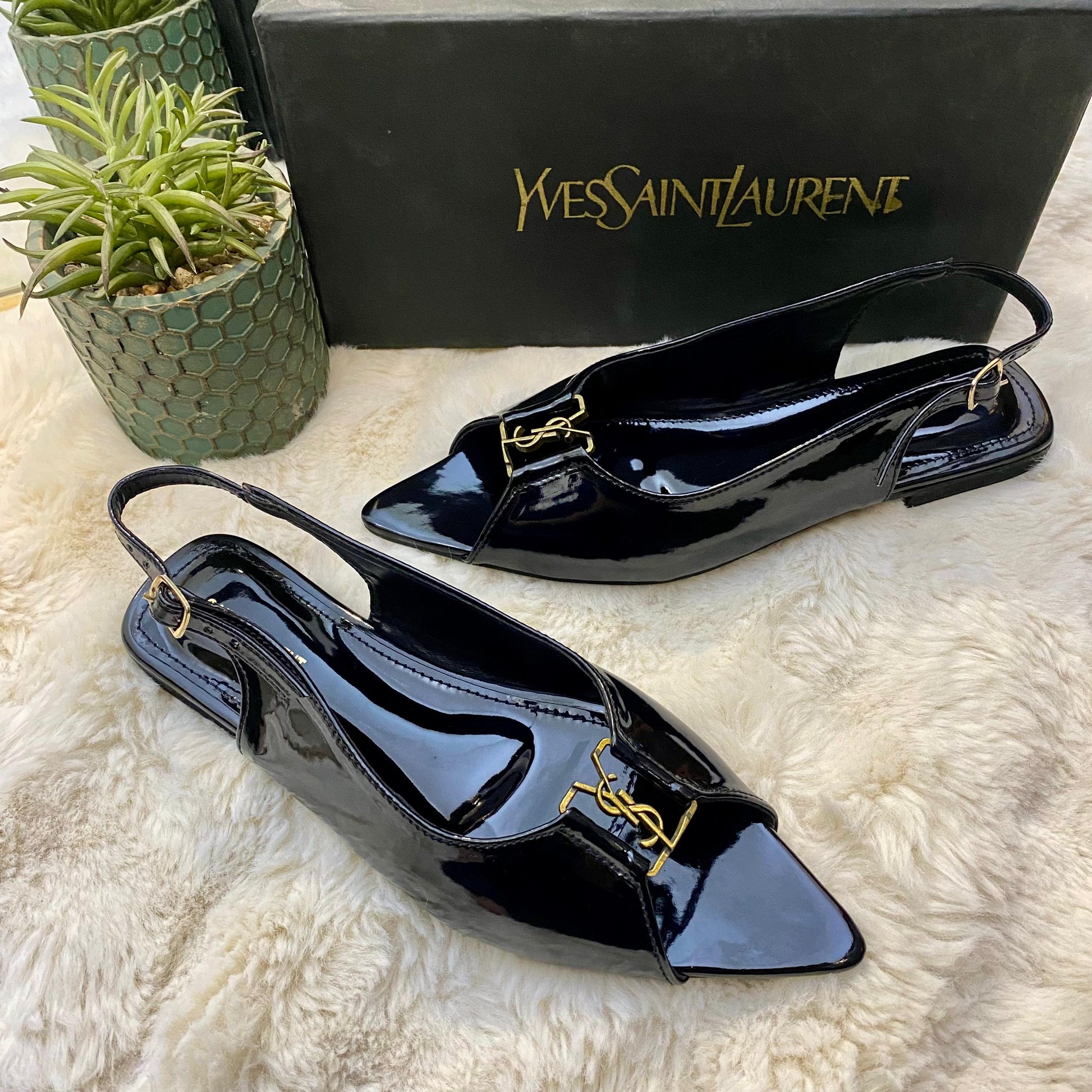 These pointed-toe slingback flats feature a sleek patent finish that adds instant glamour to any outfit. The signature metal YSL logo embellishment on the front exudes class and refinement, making these flats a standout piece for both formal and chic casual looks.